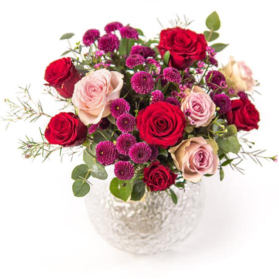 A traditional hand-tied bouquet featuring red roses, pink roses, lilac wax flowers, and seasonal foliage. Perfect for brightening their day while remaining affordable for you and lovingly hand-prepared and delivered by a local florist.