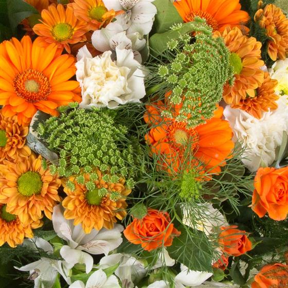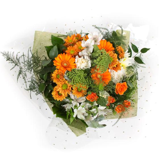 A simple hand-tied bunch of white and orange blooms including gerberas, chrysanthemums, carnations and alstromeria.