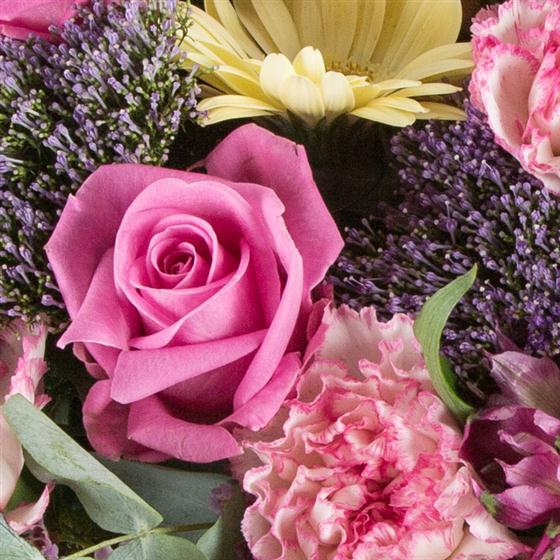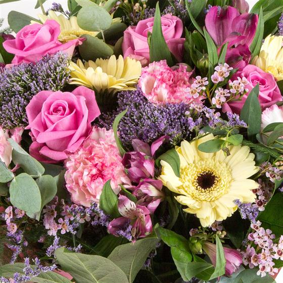 A delightful gift of lemon and pink blooms with a hint of lilac including roses and gerberas.