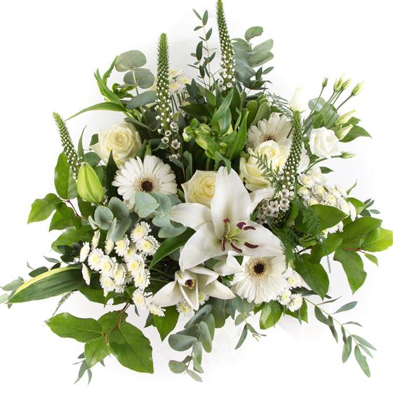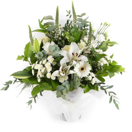An elegant hand-tied bouquet of white lilies, roses, mini gerberas, chrysanthemums and flowing foliage.