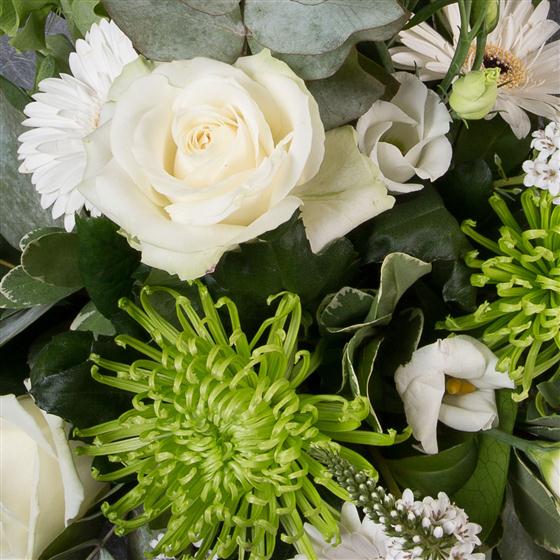 A stunning, simple and contemporary cube arrangement in whites and limes, including molucella, shamrock blooms and roses.