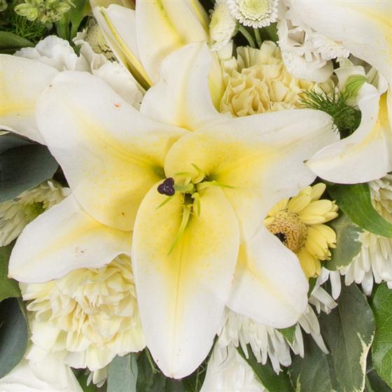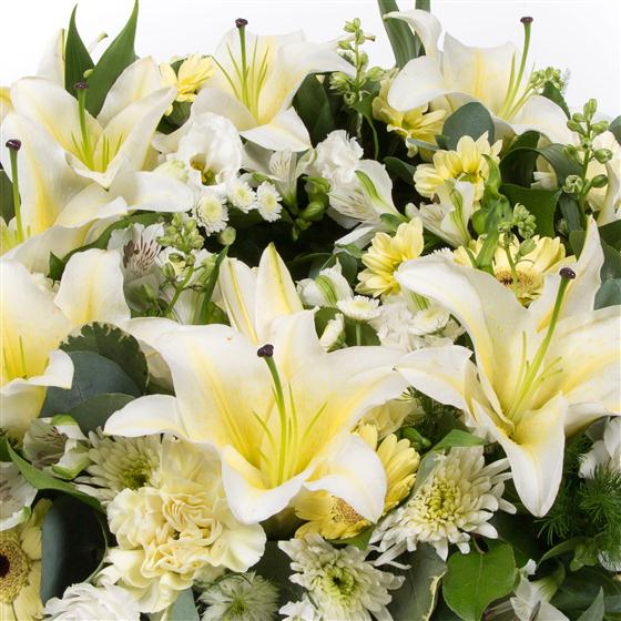 Subtle lemons and creams incorporating lilies* (subject to avalibility) and alstromeria combine with delicate solidaster to create this elegant wreath.